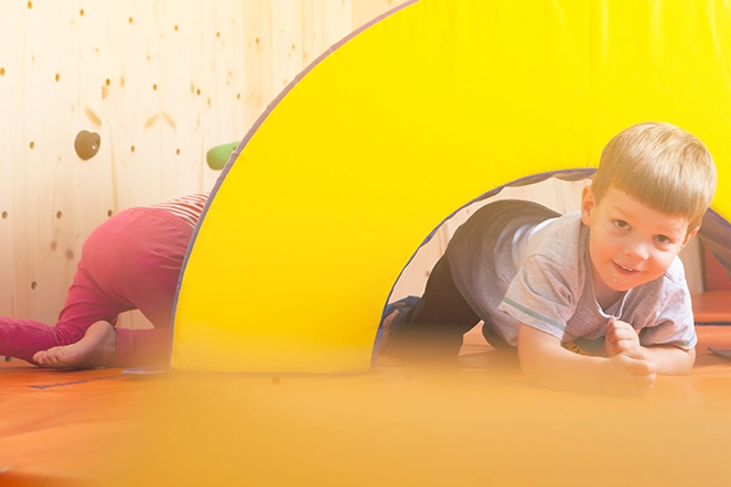Für die Bewegungsentwicklung ist ein grosser Bewegungsraum mit Kletterwand und diversen Turnelementen vorhanden. Dort können sich die Kinder austoben und ihre motorischen Fähigkeiten werden gefördert.